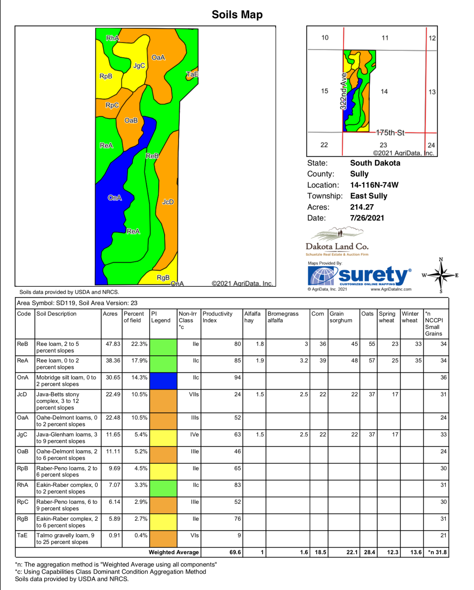 Current cropland acres are planted to Winter Wheat and have a cash lease until 2022 crop year with a ROI rental rate. The primary soils include Mobridge Silt Loam and Ree LoaM. These class II soils have productivity indexes ranging from 85-80 SPI. Highly productive cropland in the area. These productive soils provide for an excellent grain rotation including corn, soybeans, wheat, grain sorghum and sunflowers. This particular area can produce 100-140 per acre bushel corn, with 40-70 bushels/acre of winter or spring wheat, and the most profitable crop of sunflowers which can yield over #2,500.